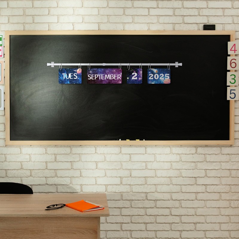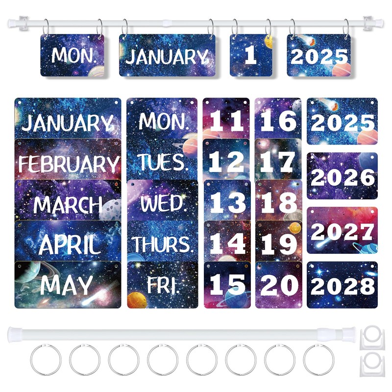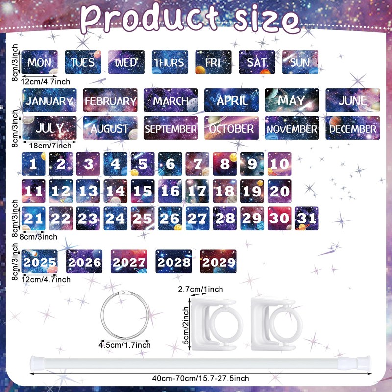 - Adjustable to Fit Your Space: featuring a rod that adjusts from 15.7” to 27.6”, this Outer Space Calendar Bulletin Board set offers flexibility to fit various spaces; Outer Space style calendar bulletin board set is ideal for decorating bulletin boards in the classroom