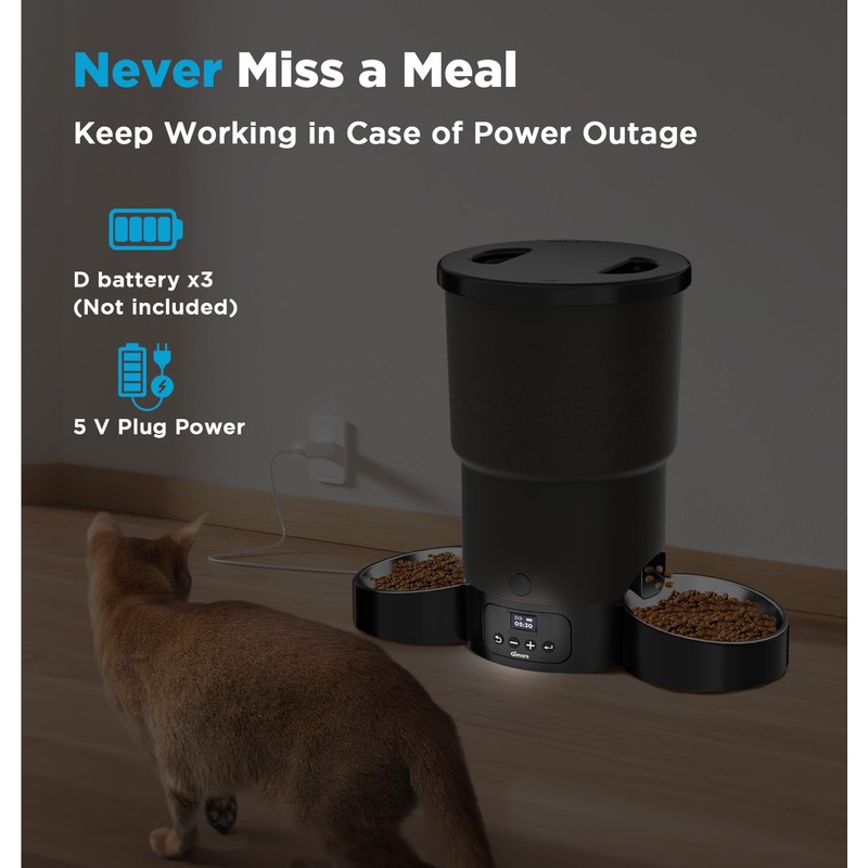 - Gimars 5L Automatic Cat Feeders for 2 Cats, 12 Portions 6 Meals Per Day Timed Automatic Cat Food Dispenser with 2 Stainless Bowls, Dual Power Supply, 10s Meal Call Easy Set Up Auto Pet Feeder Black