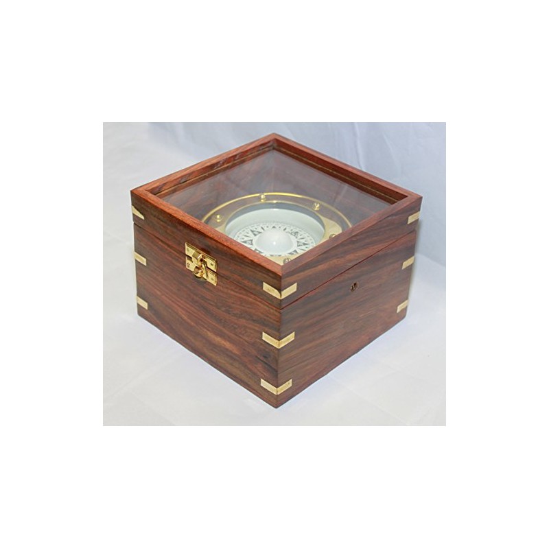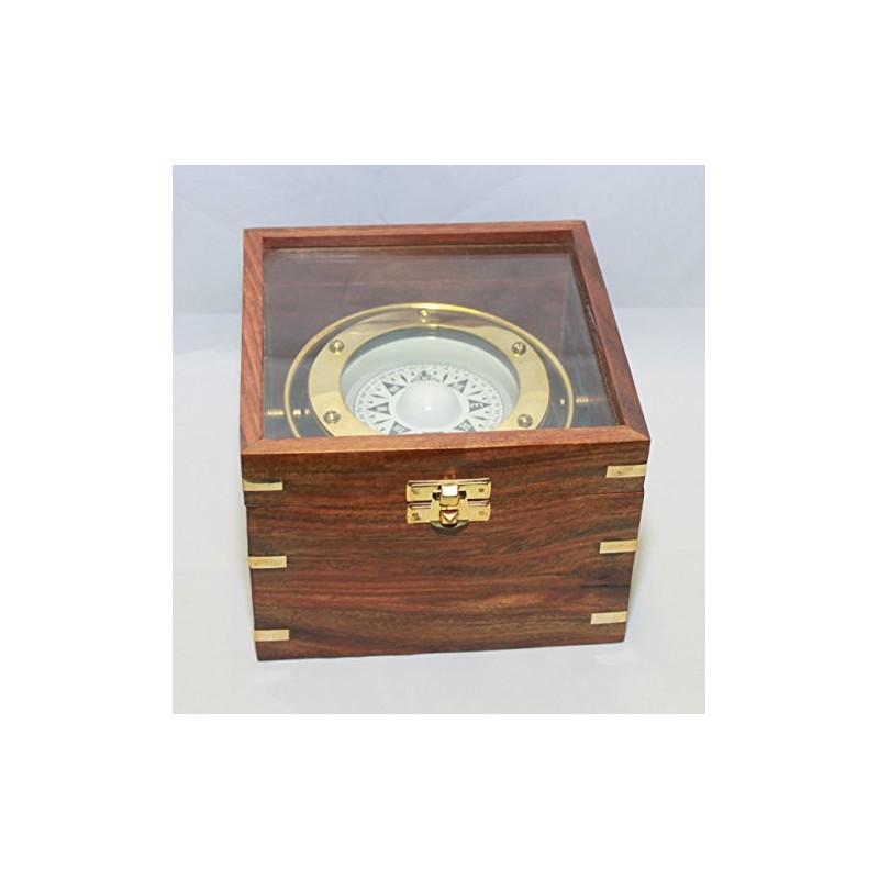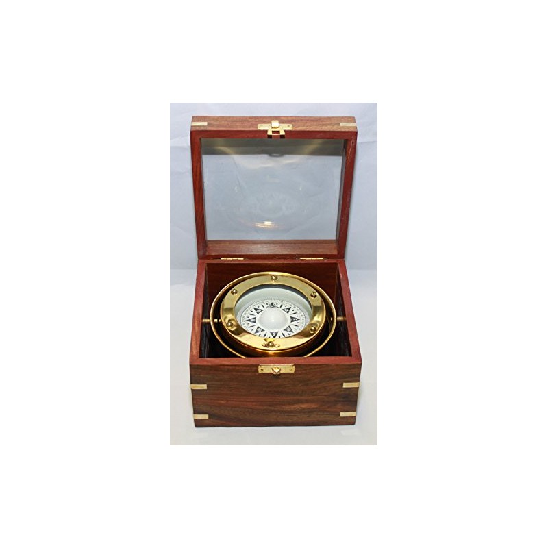 - This compass is a beautiful reproduction of a small antique brass gimbaled compass in a brass-inlaid solid hardwood box with a glass top.