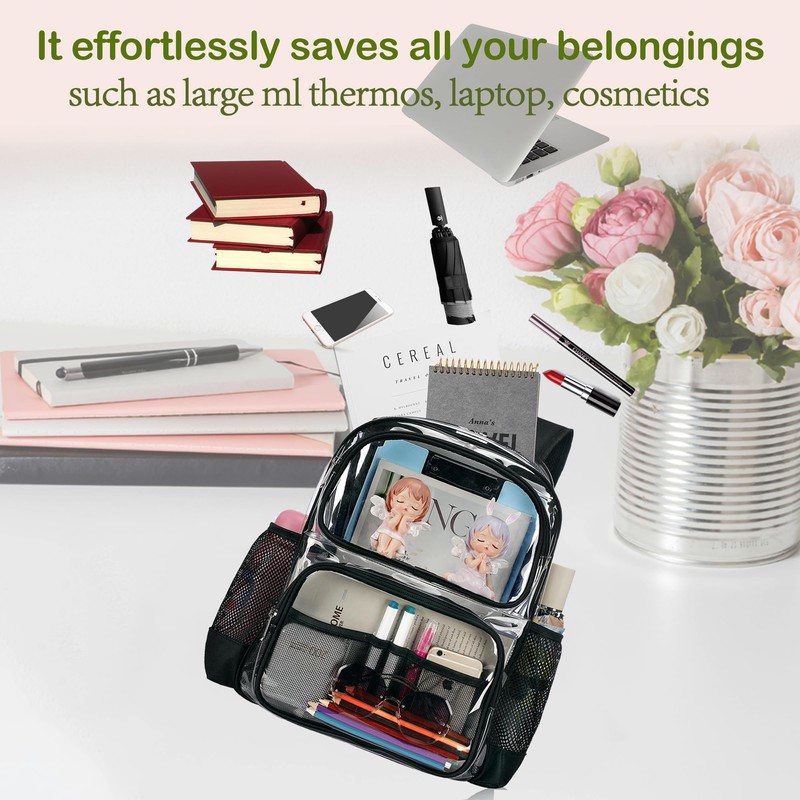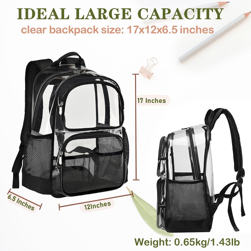 - Large Clear Backpack: With size of 17'' x 12''x 6.5'' for school backpack,the see through backpack has a main double zipper compartment that holds binders, laptops, clothing and books;1 upper front zipper pocket, 1 lower front zipper compartment, and 2 side mesh pouches.