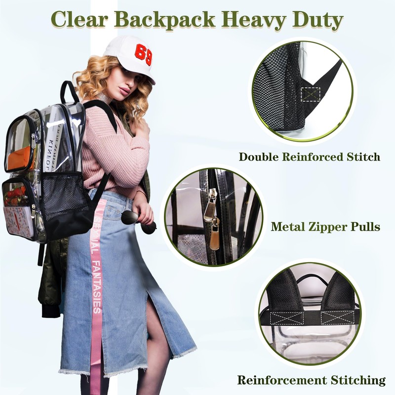 - Breathable & Adjustable Shoulder Strap: This see through backpack equipment with ring type adjustable hasp, adjust the strap length freely ,reduce the burden of weight, protect the back and shoulder effectively, more comfortable for your life.Bar-tacked with 6 times stitching at the end to reinforce its bearing, without worry break down; two straps maximum load bearing 66lb.