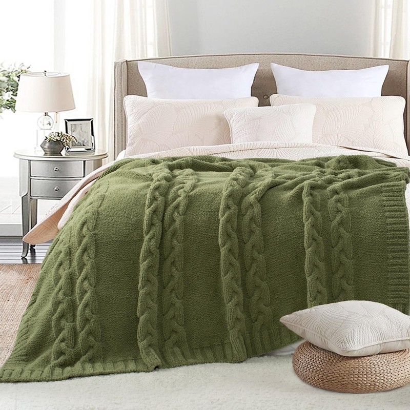 GINAMUSE Chunky Knit Blanket Super Soft Cable Fluffy Microfiber Cozy Warm Winter Blanket for Couch Sofa Bed Twin Size 60"X80" Olive Green