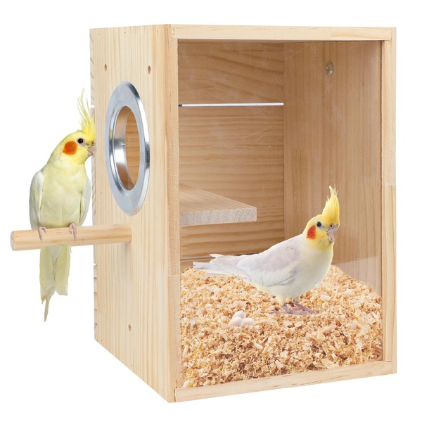 GINDOOR Parakeet Nesting Box Transparent Design, Natural Wood Bird Nest Breeding Box with Perch, Acrylic Bird House for Cage Bird Nesting Box for Small Cockatiel Lovebirds Finch Parrot Canary L