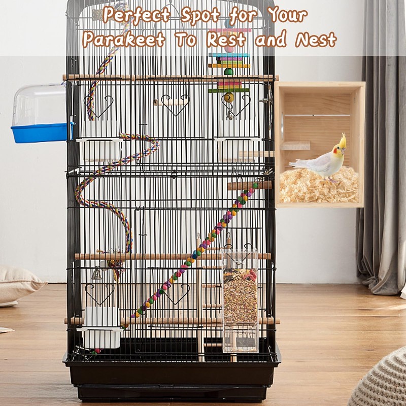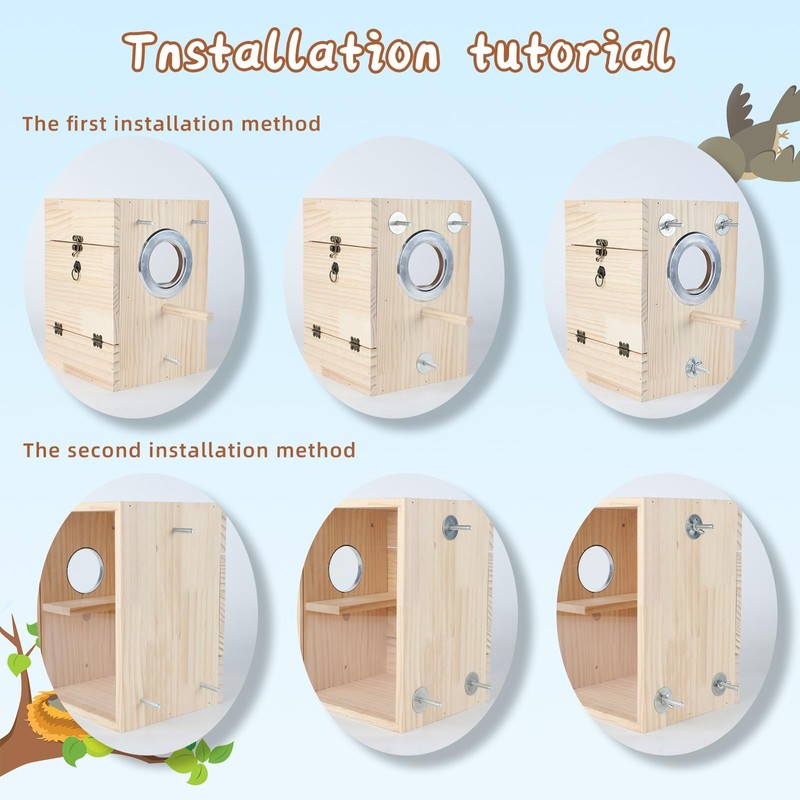The design that sets our nest boxes apart from other stores is the material of the breeding box. This three-dimensional parakeet nesting box is made of a combination of high quality pine wood and clear acrylic. Through the acrylic sides, we can not only clearly see the status of the parrots in the bird breeding box, but also observe and record the breeding and hatching process among the parrots. This nest box is suitable for small parrots and is designed to provide a comfortable and warm habitat for parrots to encourage their natural breeding and nesting behavior. Each nest box includes accessory screws and bird mats and can be fully mounted inside or outside the cage. The box features compartments to protect the eggs, a hinged lid designed to make it easy to open and close the nesting box as well as to quickly clean and replace the bird pad material. Pet owners share a common hobby of constantly searching for quality pet supplies for their critters. This parakeet nesting box is a practical house for breeding, resting, sleeping, relaxing and playing. It's also a great gift choice for your love partner!