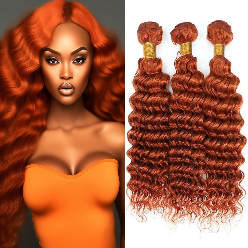 Ginger Deep Curly Bundles Human Hair Color 350 Deep Wave Bundles Orange Human Hair 8a Grade Double Weft Remy Hair Wet and Wavy Bundles Soft and Silky for Black Woman (24 26 28 inch,3 Bundles)