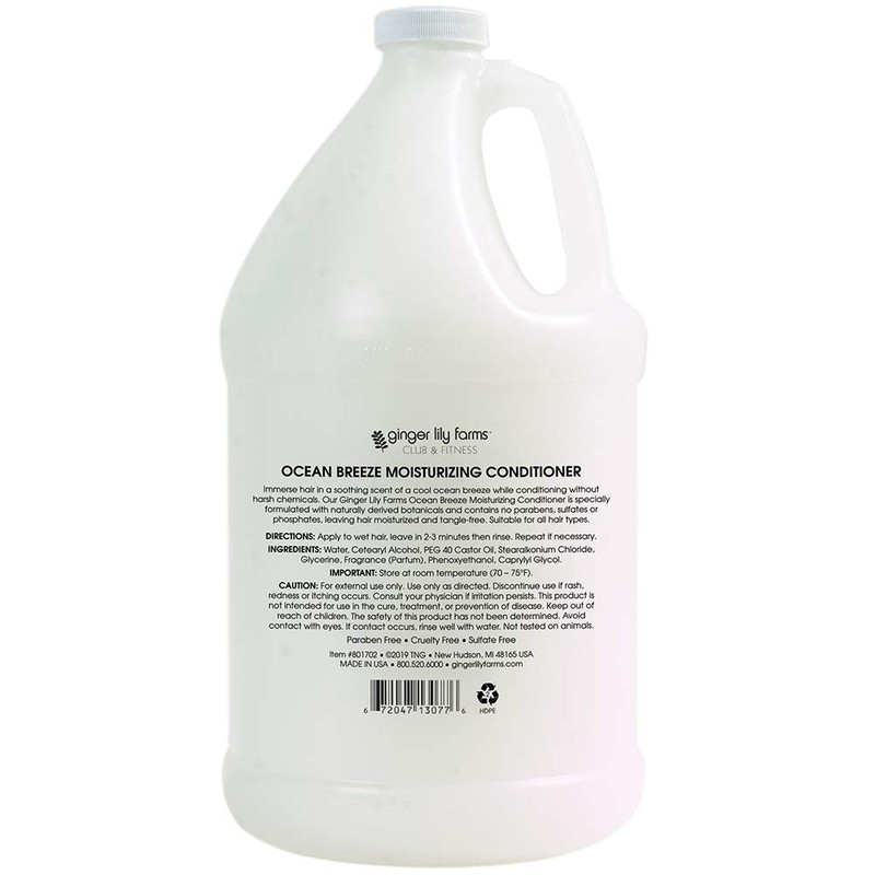 Ginger Lily Farms Botanicals ocean breeze moisturizing conditioner is formulated with Aloe, Flaxseed and sunflower seed. Recommended for commercial use in locker rooms and home use for refills. Moisturizing conditioner smooths, restores and revitalizes hair with lasting moisture for incredibly soft, shiny hair. For all hair types. Paraben, sulfate, phosphate, gluten and cruelty-free. 100% vegan.