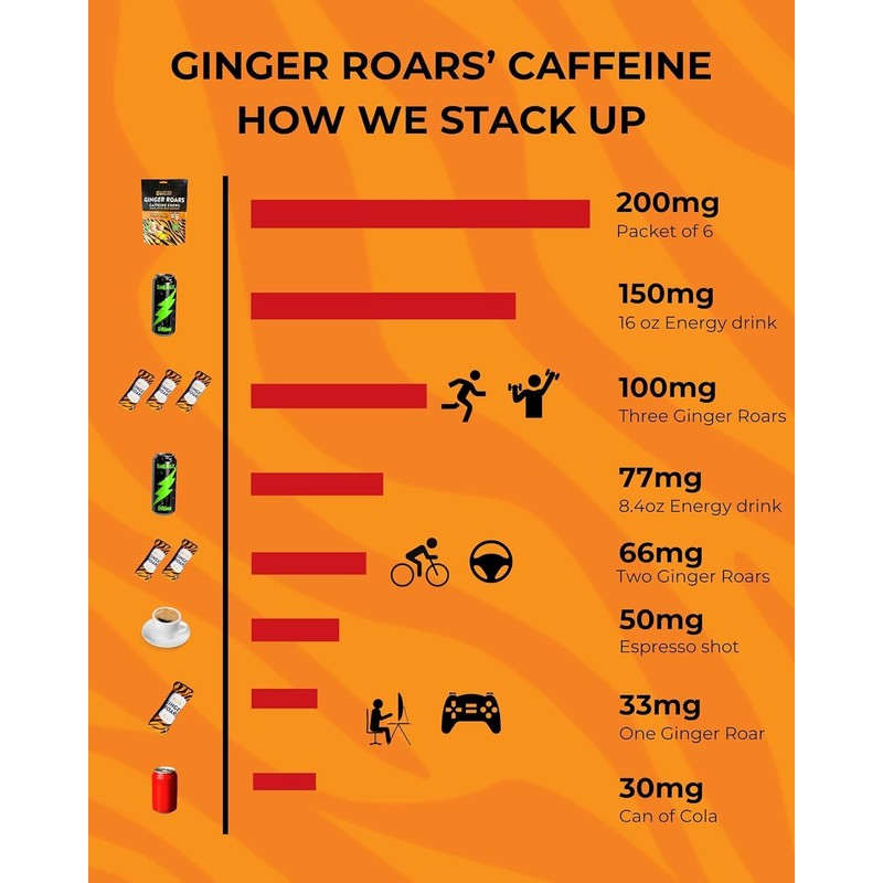 Ginger Roars Caffeine Ginger Chews - 33mg Caffeine per Candy, Natural Honey Ginger Flavor with Fiery Kick, Plant-Based Vegan Energy Snack (12 Count)