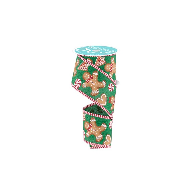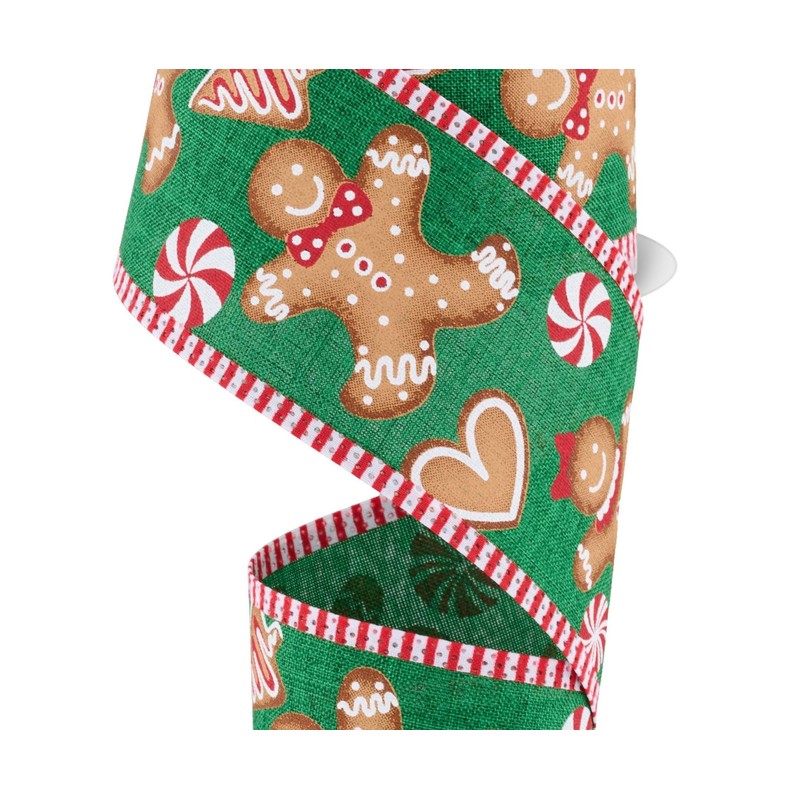Gingerbread Cookie Themed Wired Ribbon with Candy Cane Striped Edges (Emerald Green, Red, Multi, 2.5" x 10 Yards)