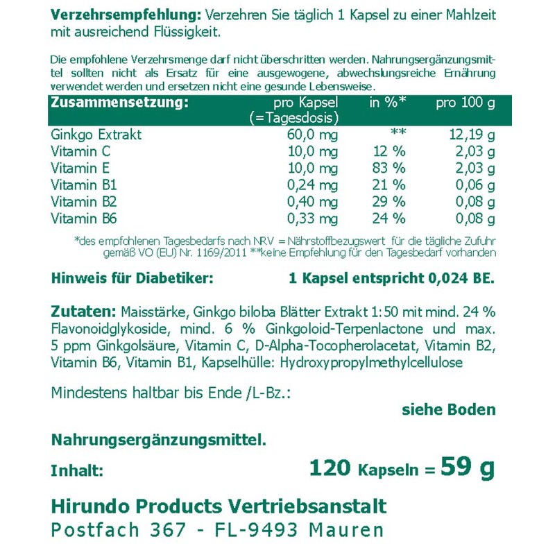 Ingredients: corn starch, ginkgo biloba leaves extract 1:50 with at least 24% flavonoid glycosides, min. 6% Ginkgoloid terpene lactones and max. 5 ppm ginkgolic acid, vitamin C, D-alpha tocopherol acetate, vitamin B2, vitamin B6, vitamin B1, capsule shell: hydroxypropylmethylcellulose.