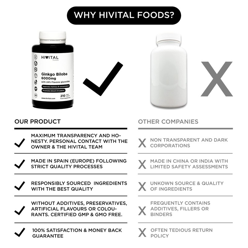 - Excellent formula based on a natural 50:1 extract of ginkgo biloba leaves with 24% flavonoids and 6% terpenes. 6000 mg of the plant to increase memory and concentration, improve blood circulation and treat varicose veins. Large product quantity at the best price: we offer 210 vegan capsules per container, supply for 7 months.