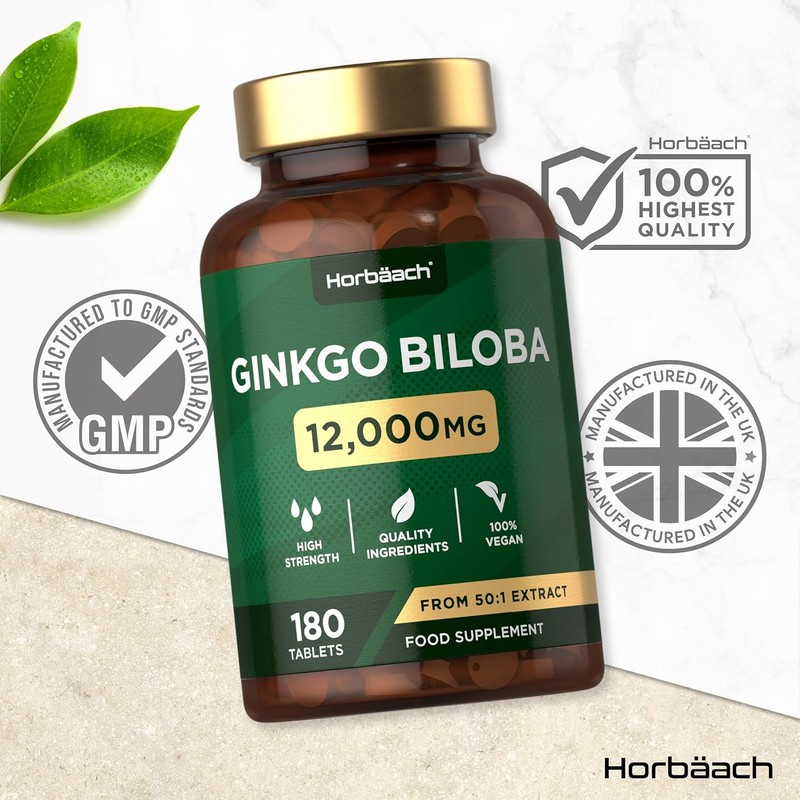Ginkgo Biloba Tablets 12000mg | High Strength 50:1 Extract with 24% Glycosides & 6% Lactones | Vegan, No Artificial Preservatives | Supports Circulation & Cognitive Function | 180 Tablets (3-Month Supply) by Horbaach