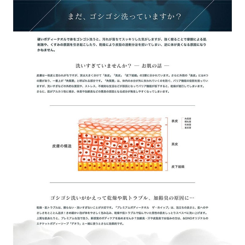 - (A new feeling of washing with a premium body towel) Are you still scrubbing? When washed with a hard type common to men's body towels, it will cause skin irritation and dryness due to friction. The Whip is an original body towel from GINO that pursues good foam and gentle on the skin. The fine foam gently envelops the body and moisturizes the skin of men who suffer from dryness. Are you starting to get a new feeling of body care with premium skin and washing with premium foams?