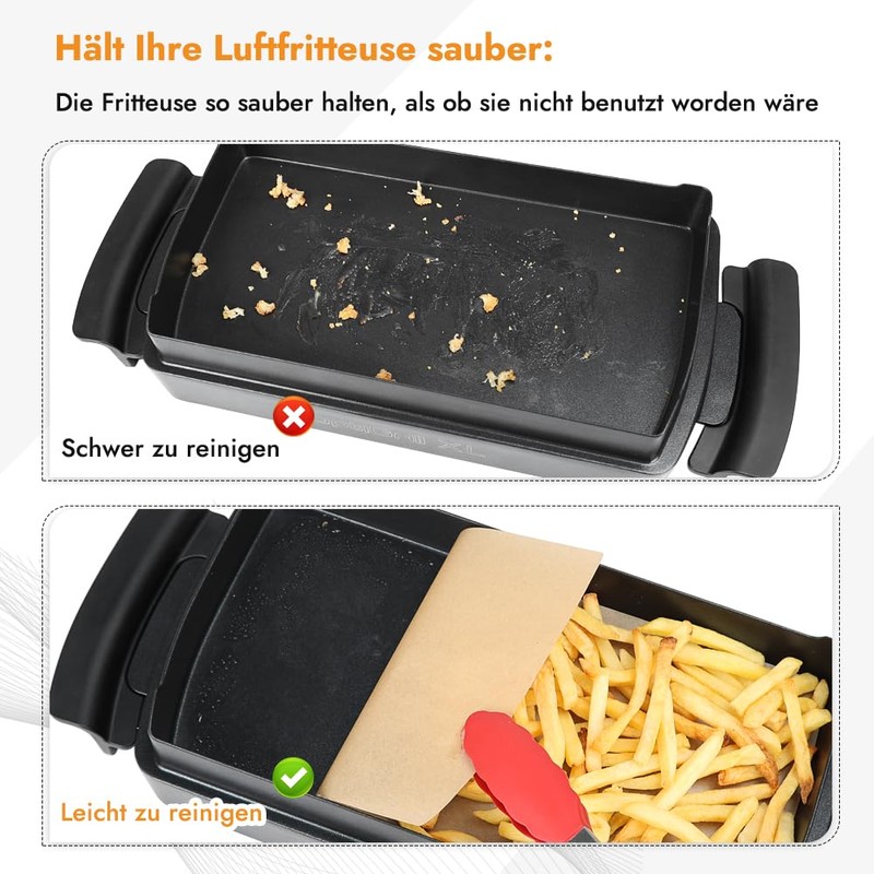 - Keep your fryer clean – the use of baking paper protects the bottom of the oven and significantly reduces the amount of food residue left in the oven. In addition, you can easily replace the baking paper when you change the food without having to clean the pan