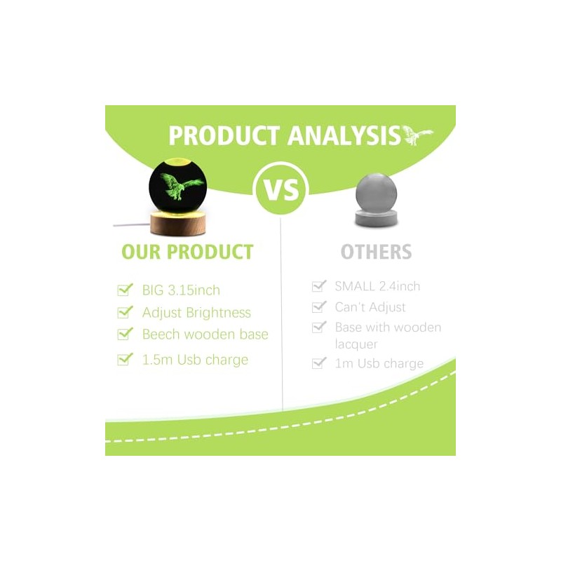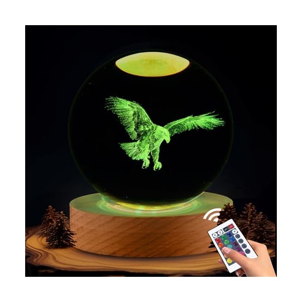 - ?Premium Materials?Made with top crystal, this ball is not only ultra-transparent and shiny but also represents the purity and clarity associated with eagles. The intricate 3D engraving brings the eagle to life, showcasing its piercing eyes and intricate feathers. The wooden base with 6 LEDs illuminates the crystal, creating a magical display that embodies the essence of these majestic creatures.