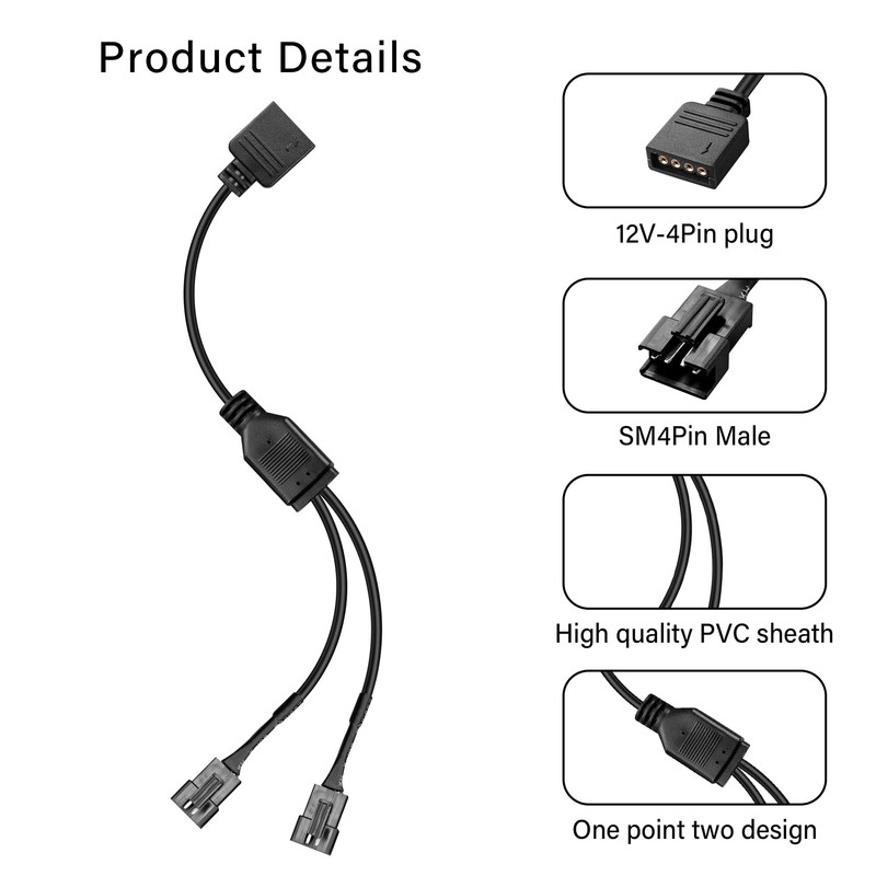 • Connector 1: 12V 4-pin female plug; Connector 2: Two SM 4-pin male plugs; Number of cables: 4PCS; Quantity of accessories: 4PCS; Applicable voltage: DC 12V; Cable length: 30cm/11.8inches (note: including plug length).