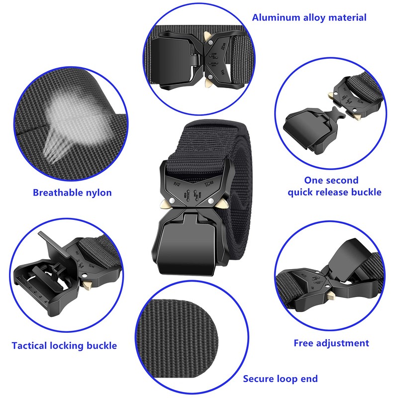 This tactical belt features a military belt buckle made from aviation class aluminum alloy, which is a third lighter than zinc alloy buckle.