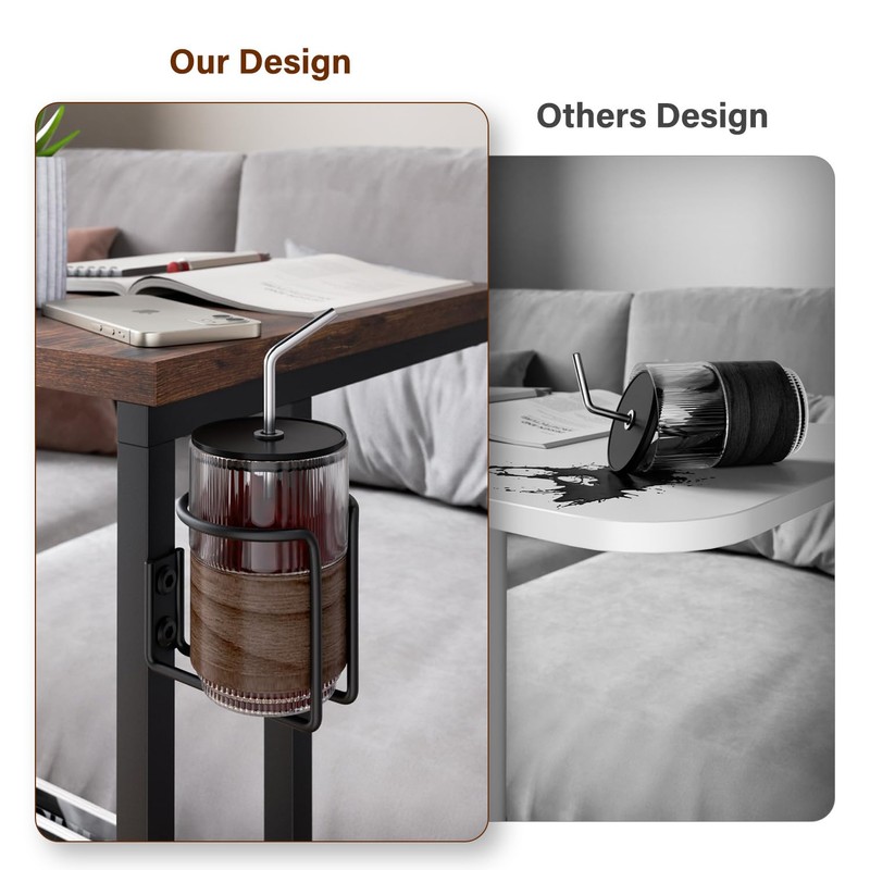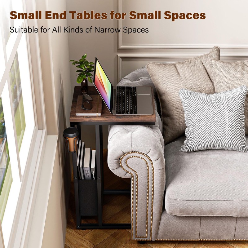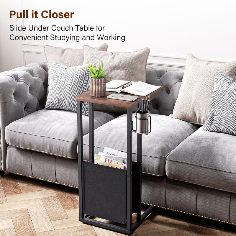 - 【Space Saving Design】This c shaped end table measures 11.8W*16.14D*26.77H, small footprint, it is suitable for all kinds of narrow spaces. The innovative C-shaped design allows this skinny side table to easily slide next to the couch or under the bed. Giving you easy access to snacks, drinks, cell phones and tablets without sacrificing floor space.