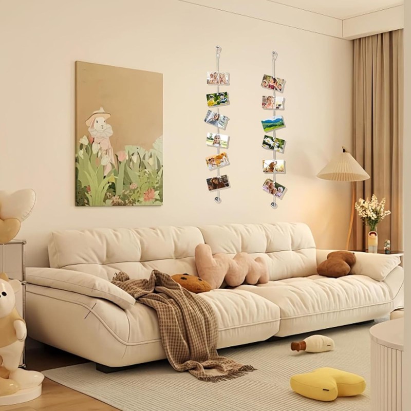 - Easy to use: features a pre-attached loop for quick hanging—just attach to a wall hook or nail. The slim, vertical design saves space while holding multiple photos neatly. Steel beads keep wires taut for a polished look