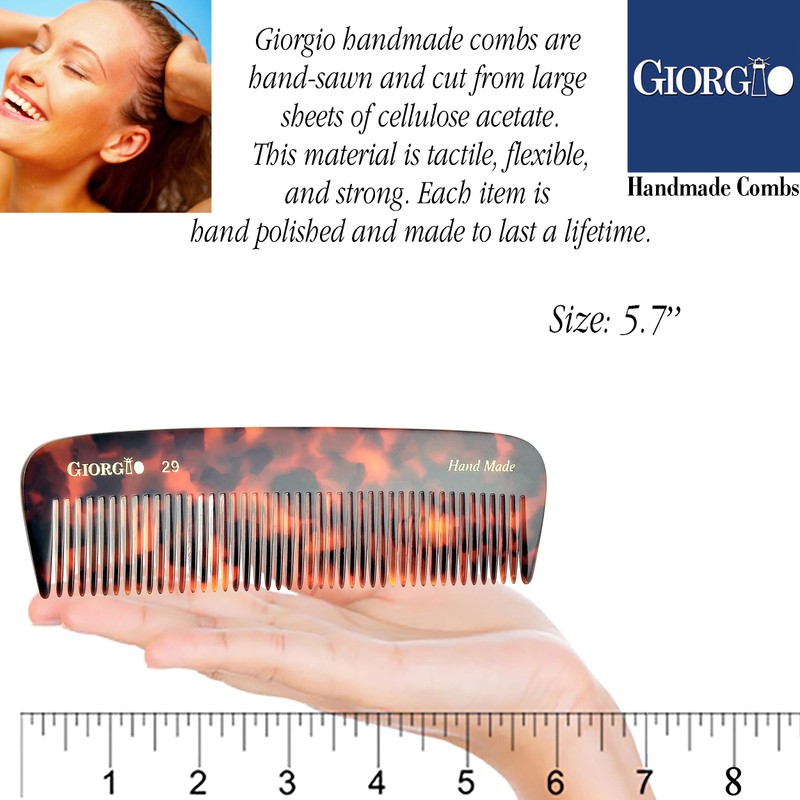 Giorgio G29 Pocket / Dresser Comb 5.7 Inch Medium tokyo finish. Flexible women and men Hair, Beard & Mustache Pocket Comb. Hand-Made of quality Durable Cellulose, Saw cut and Hand Polished for ultimate and effortless smooth glide. Prevent Pulling and hair breakage. Rounded tips for sensitive scalps and release of hair's natural oils. Hand Made of quality Cellulose , a non- petroleum base material, that’s why they have minimal static. Products made from Cellulose are derived from vegetable matter, a modified polymer derived from cotton and do not harm the environment in any way. Smooth, rounded teeth for sensitive skin stimulating the hair cuticle’s and release of hair's natural oils for a hair strong and healthy. Anti-static. A women and men favorite comb for both hair and quick beard and mustache care. Easier to clean than wood. Unlike beard brushes, combs for beard and moustache are best used on damp hair. Ease to clean with shampoo under the tap. 100% money back guarantee, if you're not happy with your purchase just return the GIORGIO Comb to us and we'll refund your money.
