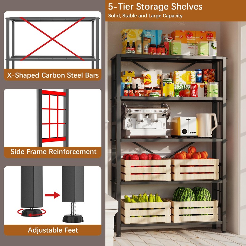 <p><b>GIOTORENT Heavy-Duty Metal Storage Shelf – 1500LB Capacity, Rust-Resistant, Stylish Design</b></p><p><b>🌟 Sturdy & Moisture-Proof</b></p><p>Built with high-strength steel, each shelf holds 300 lbs for heavy items like tools or kitchen appliances. Powder-coated finish resists rust, water, and corrosion—perfect for kitchens, basements, or garages. Smooth surface wipes clean easily.</p><p><b>🔧 Tool-Free Assembly</b></p><p>No plastic parts—assembles quickly with included screws/nuts. Adjustable feet level uneven floors (concrete, tiles) for stability without wobbling. Ready in minutes for any space.</p><p><b>🗄️ Spacious 5-Tier Storage</b></p><p>Large 14.2"D x 37.8"W x 65.8"H size offers vertical storage for kitchens (pots, pantry), garages (tools, sports gear), or living rooms (books, decor). Declutter any room efficiently.</p><p><b>✨ Modern #-Shape Design</b></p><p>Unique #-pattern side panels add style to functionality. Industrial yet sleek look fits modern, minimalist, or farmhouse decor. Great housewarming gift for practical, stylish storage.</p><p><b>🛎️ 24-Hour Support</b></p><p>Message us for missing parts or questions—we respond within 24 hours with quick solutions. Shop confidently with our hassle-free service.</p><p><b>📏 Key Specs</b></p><p>Material: Powder-coated steel</p><p>Capacity: 300 lbs/shelf (even load)</p><p>Size: 14.2"D x 37.8"W x 65.8"H</p><p>Layers: 5 (fixed height)</p><p>Tools: Screwdriver needed (Included)</p><p><i>Organize heavy, bulky items effortlessly with this durable, easy-to-assemble shelf—built for performance, designed for modern life.</i></p>