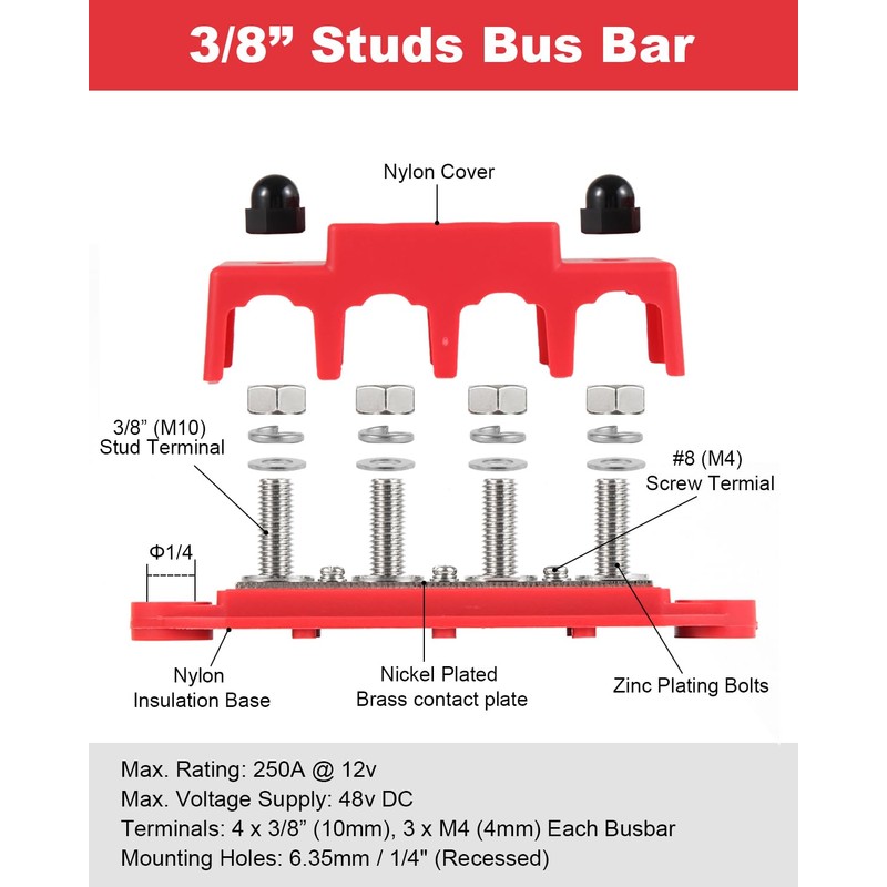 - Power Distribution Bar Specifications - 4 x 3/8"(10mm) studs terminal and 3 x #8 (M4) screw terminals, Mounting Holes: 6.35mm / 1/4" (Recessed), Max. Rating: 250A @ 12v, Max. Voltage Supply: 48v DC