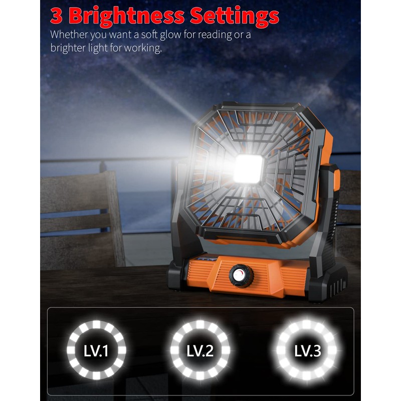 • Bright LED Lights &Timer Function The camping fan features bright LED lights with three brightness modes, making it ideal for use in low-light conditions or at night.The fan can be set to turn off automatically after 1, 2, 3, or 4 hours, giving you peace of mind and conserving energy.