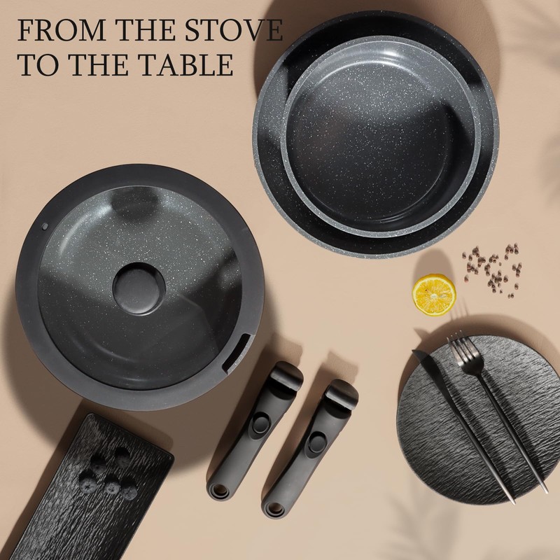 - Convenient Cookware Set - Removable handle for the ultimate versatility– go from all kinds of stoves to the oven, to the grill, to the fridge, and onto the dinner table in a click
