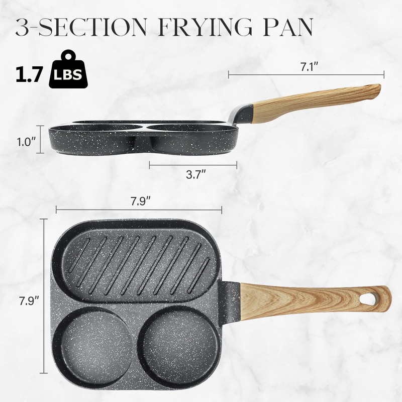 • Convenient 3-in-1 Design - With 3 separate sections, our grill pan allows you to cook 3 different foods simultaneously. This versatile frying pan simplifies your cooking process, eliminating the need for multiple pans while ensuring flavors remain distinct.