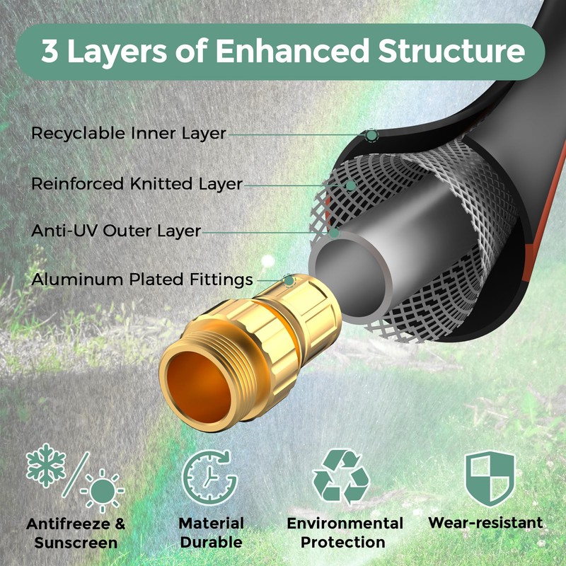 - No Kink: The newest material is memoryless, the heavy duty hose will not kink, and easily coil and uncoil. The 3-layers design allows the hose to remain flexible under extreme temperatures.