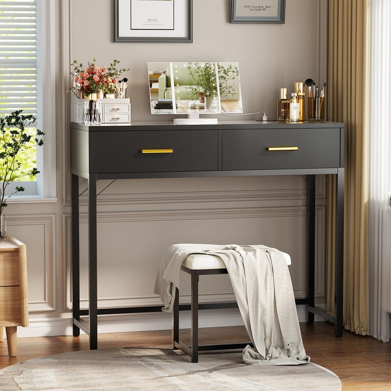 - đăVanity Desk with Charging StationăOur vanity is equipped with 3 Outlets & 2 USB on the desktop, when you enjoy your makeup, you can use your hair dryer, curling iron, and charge your phone at the same time without needing to go elsewhere. It's definitely more convenient than other vanities that haven't a charging station.