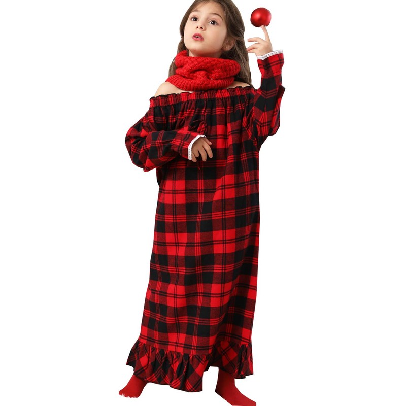 Girls Cotton Red Plaid Nightgowns Sleepwear Sleep Dress Kids Princess Pajamas Long Sleeve Christmas