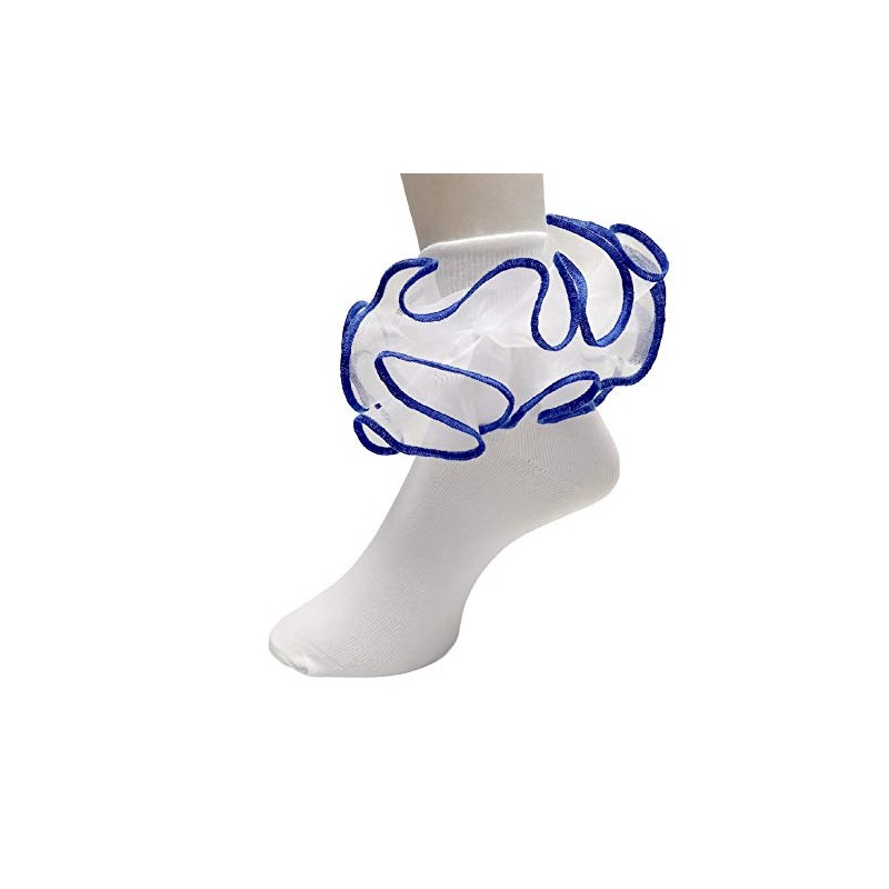 Girls Double Ruffle Socks - Big Full Organza with Trim Pageant Fanfare Foldover Ankle Style - 6-12 Month Old (3-4, White w/ Royal Blue Trim)