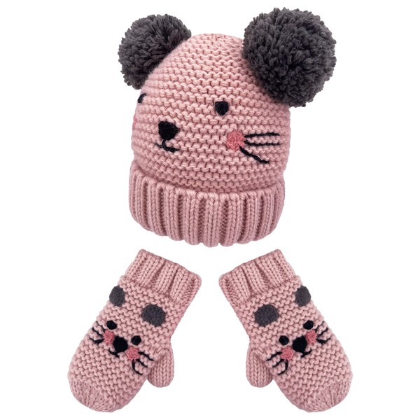 Girls Hats and Mittens Set Winter Knitted Pom Pom Bobble Beanie Hat and Mittens Gloves 2 Piece Set Rabbit Design (Rabbit, L)
