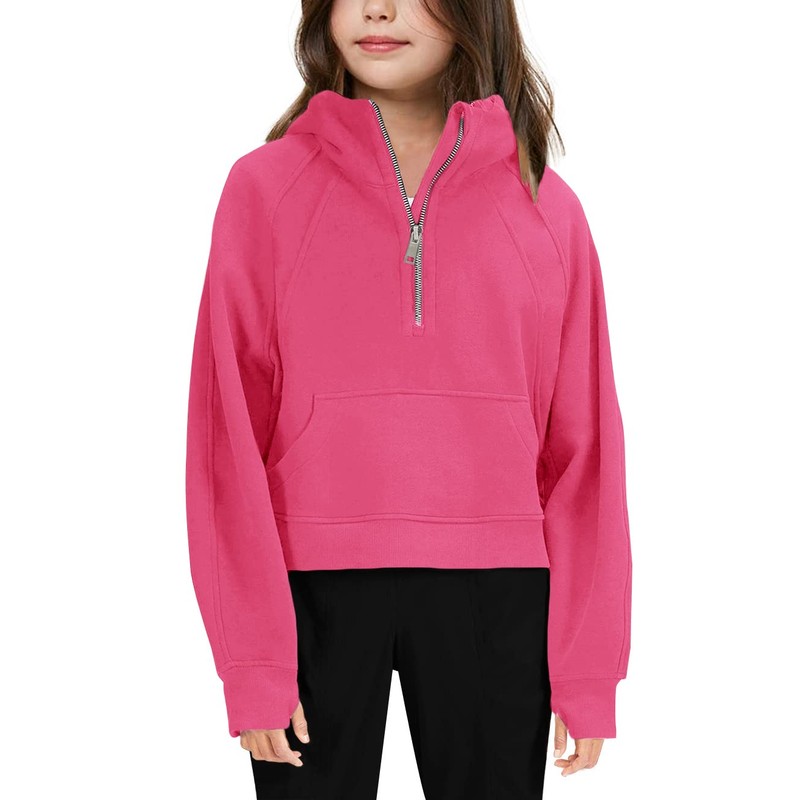 Girls' Hoodies Sweatshirts Half Zipper Pullover Crop Tops for Teen Girls Long Sleeve Sweater Thumb Hole Rose Red