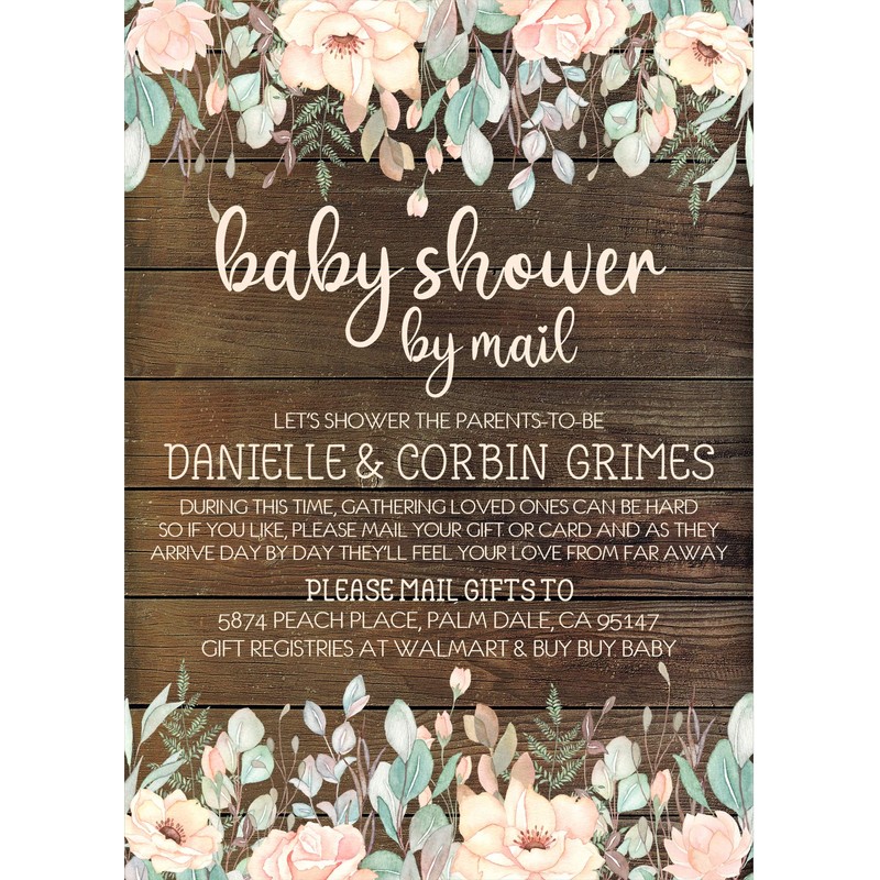 Girls Rustic Peach And Mint Baby Shower By Mail Invitations, Virtual Baby Shower Invitation Card Sets With Matching Return Address Labels, Far Away Baby Shower Invitations For Girls