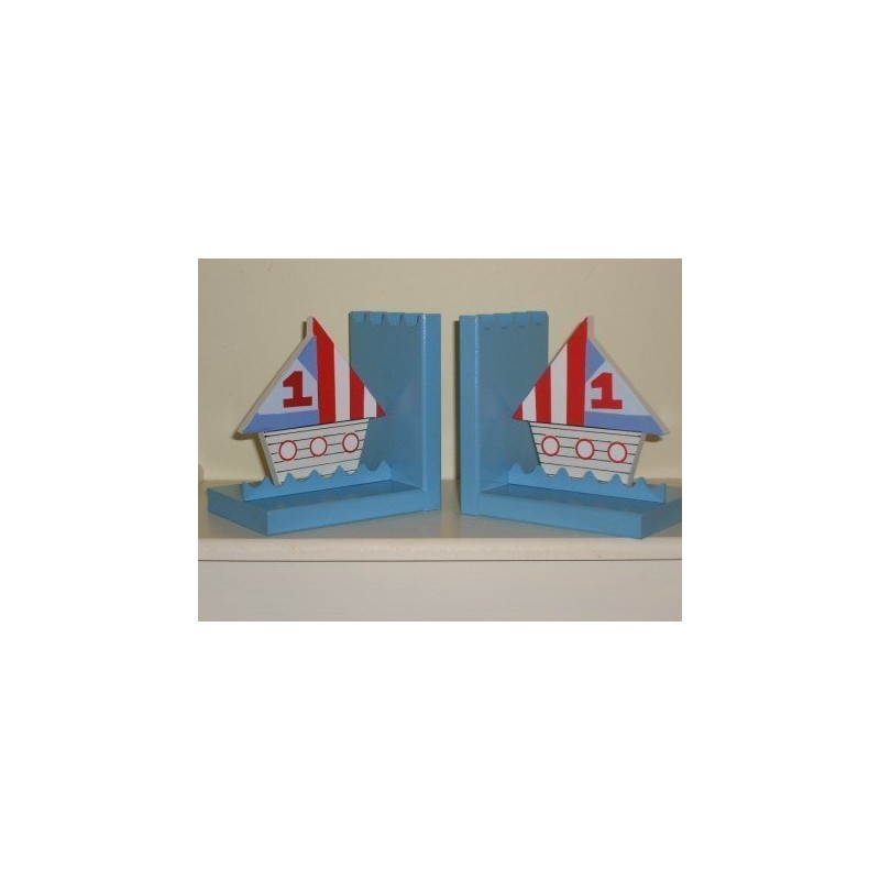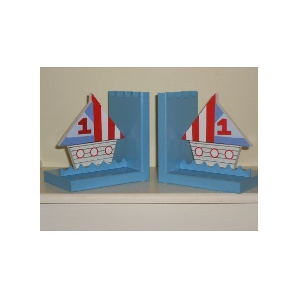 - In the middle of each of the bookends there is one large boat shape painted white with red port holes and red, white and blue sails. Perfect for a boys Nautical Themed Bedroom. Size approx: 12 x 13