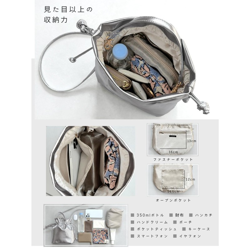 - Update your summer outfit with a drawstring form and metallic material. The shiny metallic material and rounded drawstring silhouette combine the seasonal and trendy feeling. The design looks great with simple outfits and adds a glamorous touch to a light summer style
