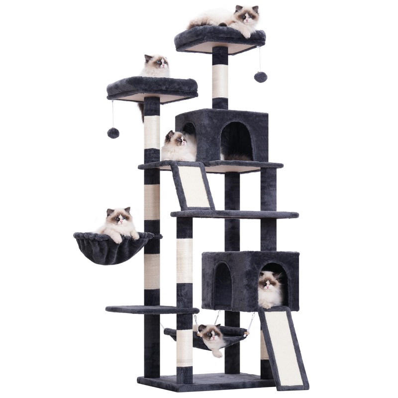 - More Funs from The Large Cat Tree: The comfortable hammock, the deep hanging basket, the cat scratching posts where cats can sharpen their claws at will, and the suspended fur balls all contribute to creating a warm and cozy living environment for cats.