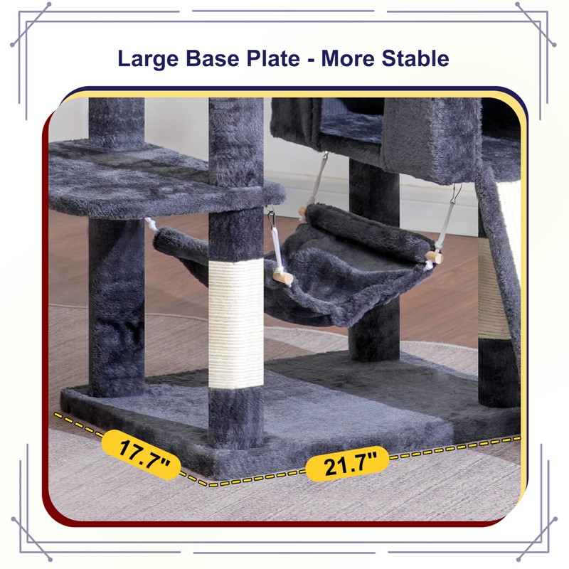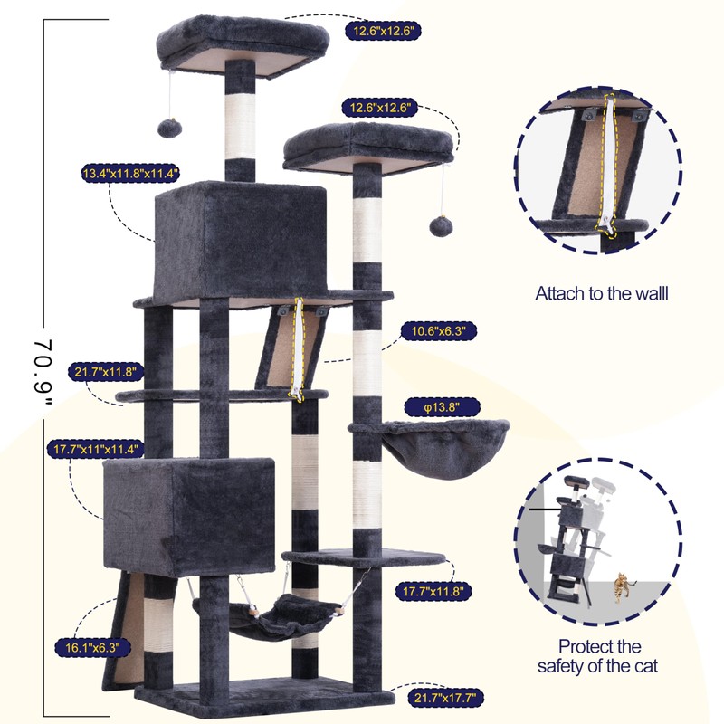 - Large Base, More Study: The spacious base(21.7''L x 17.7''W) provides excellent stability. Additionally, the included anti-tipping straps can be used to secure this cat tree to the wall. Even when adult cats or large cats climb up and down, it is not easy for the cat tree to tip over, making it much safer.