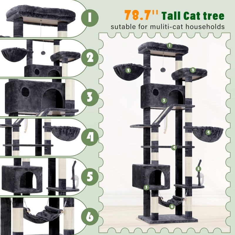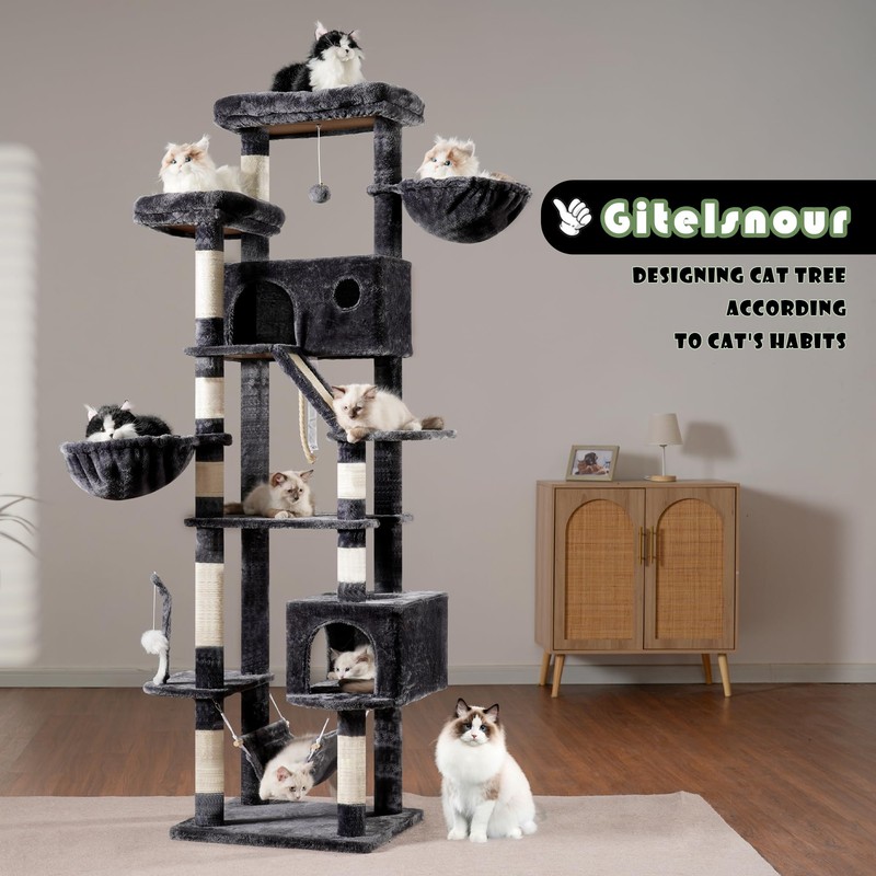 Gitelsnour Cat Tree for Large Cats, 78.7"(200cm) Tall Cat Tower for Indoor Cats Multiple Cats with Large Top Perch, Cat Condo, Cat Hammcok, Cat Scratching Post, Dark Gray GCT031G