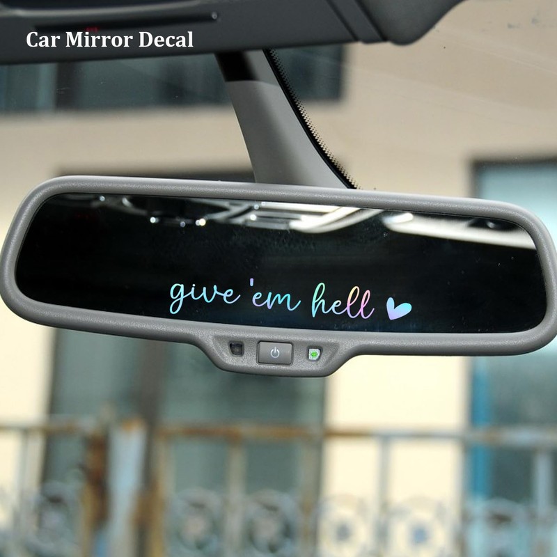 - "Give Em Hell" mirror decal, perfect for adding a bold affirmation to your car or rearview mirror.