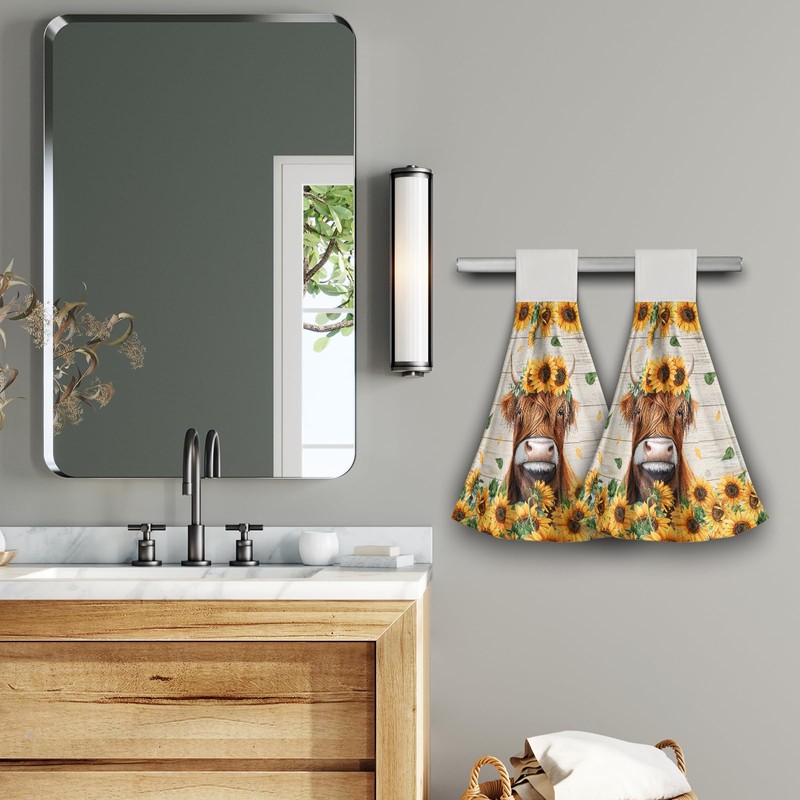 Giwawa Highland Cow Kitchen Hanging Towel Set of 2, Summer Sunflower Cattle Hand Tie Towel with Loop & Hook, Wood Board Floral Soft Washcloth Dish Tea Bar Towel for Bathroom Gym Decor