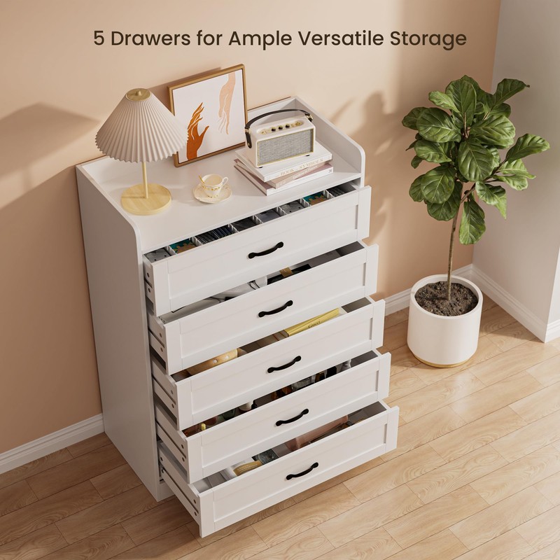 - ELEGANT DESIGN: The flat top of the 5-drawer dresser can accommodate lamps, books, etc., the rounded corners also prevent items from falling, the widened cabinet feet enhance stability, and the elegant handles increase beauty