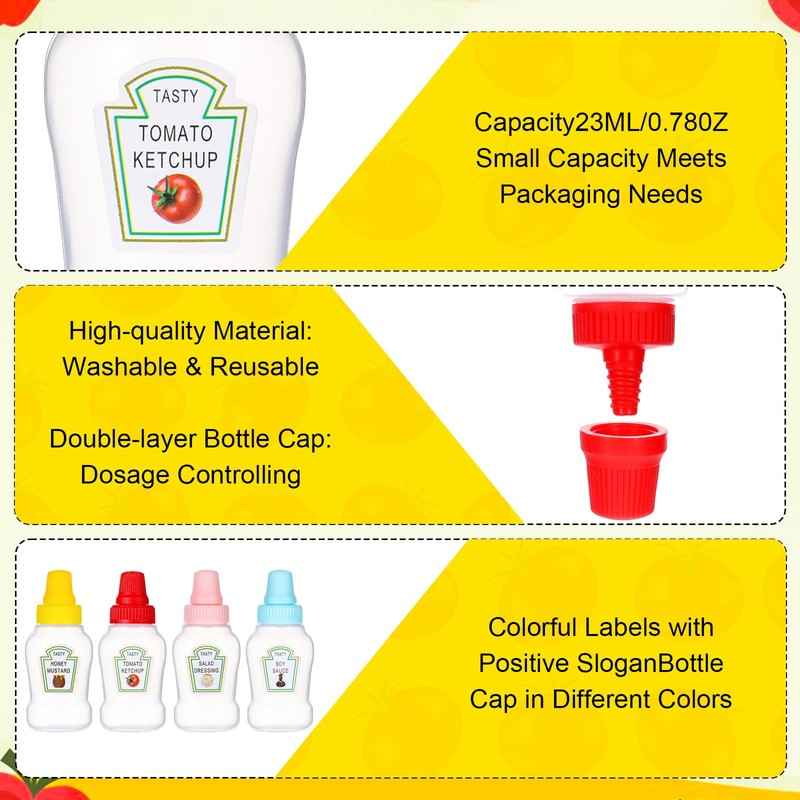 - 【Widely Application】These mini condiment containers are ideal for holding a variety of condiments, including ketchup, mustard, mayonnaise, hot sauce, and soy sauce. Whether you're at a buffet, barbecue, picnic, these mini ketchup bottles can make you enjoy delicious meals anywhere, suitable for cooking, travel, camping, and restaurant use
