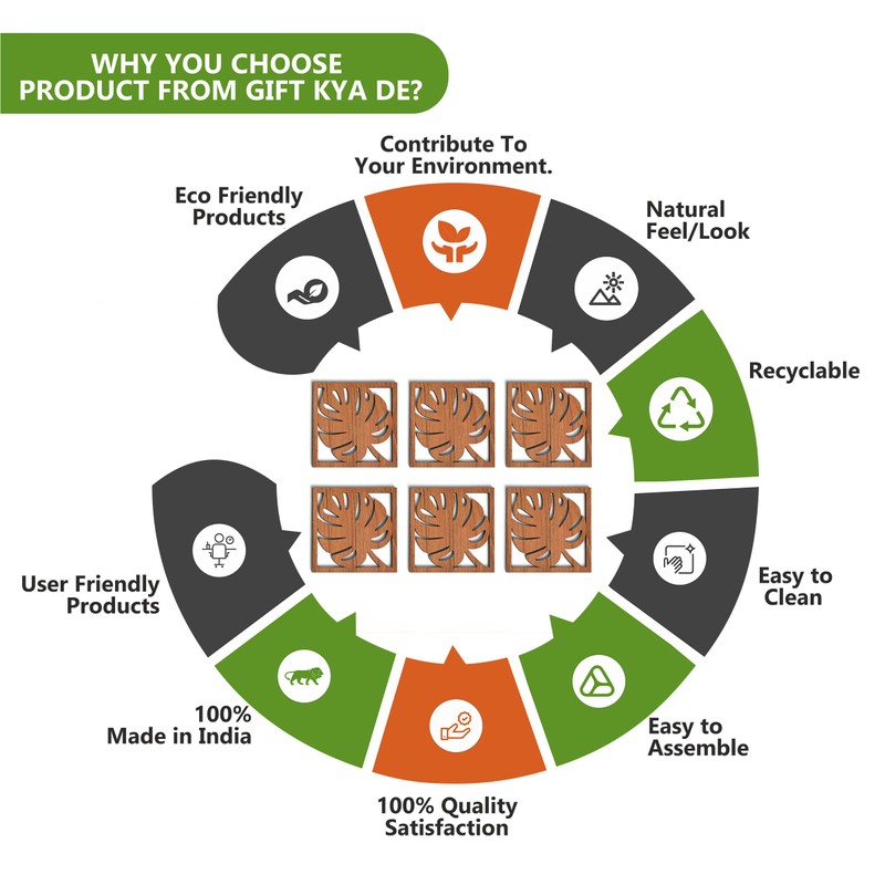 This GKD set includes six 3.8″ × 3.8″ square MDF coasters featuring cutwork leaf motifs with a sleek 5 mm polished finish. Each coaster guards against heat, stains, and scratches while providing non-slip stability. Accompanied by a matching wooden stand, this set offers elegant storage and display. Eco-friendly and durable, these coasters are perfect for tea cups, coffee mugs, glasses, or barware—and make a stylish gift for any home or nature enthusiast.