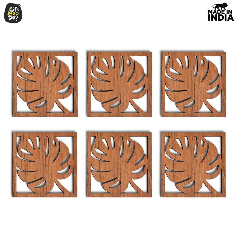 GKD Wooden Coasters for Drink, Leaf Cutwork Square MDF Coaster Set of 6 with ...