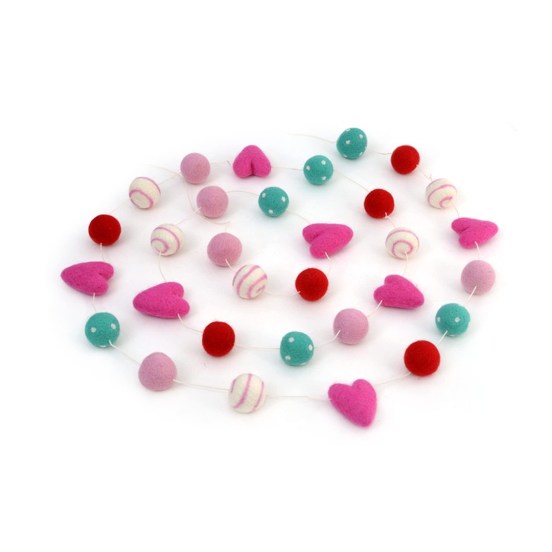 Glaciart One Guirnalda de bolas de fieltro de San Valentín con corazones rojos, hecha a mano en Nepal con lana de Nueva Zelanda, reutilizable, duradera, elegante y versátil, fácil de colgar y mantener: 8 pies, 7 corazones, 24 bolas