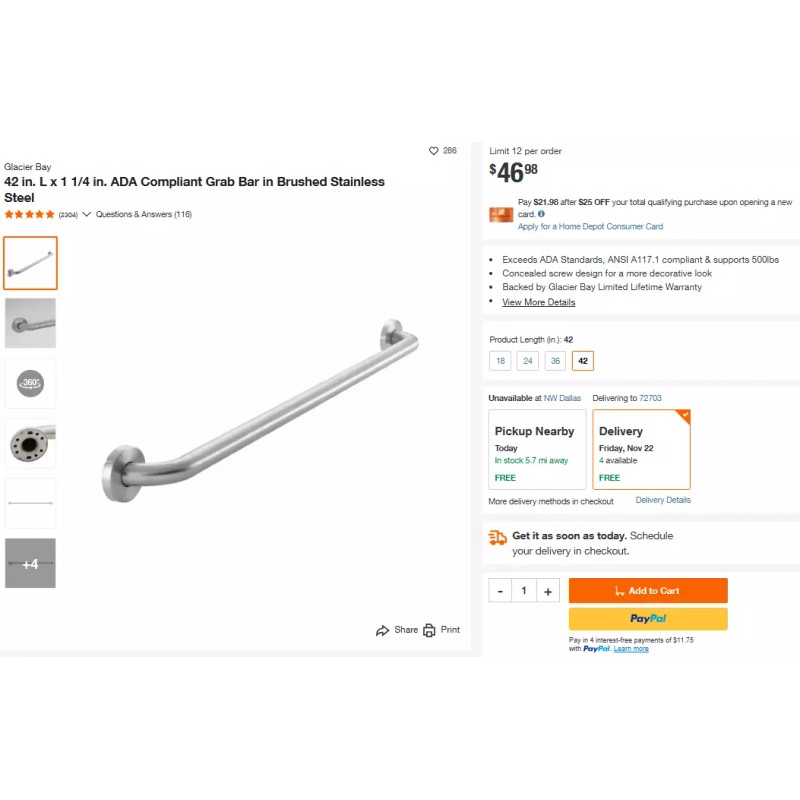 Glacier Bay 42 in. L 1 1/4 in. ADA Compliant Grab Bar in Brushed Stainless Steel