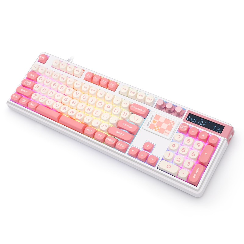 Glacier Skyloong GK104 Pro Full Size, Wireless/Wired Detachable USB-C Hot Swappable Mechanical Keyboard with Screen, Knobs, Calculator, Split Space Bar Compatible (White/Pink, Premium Cable)