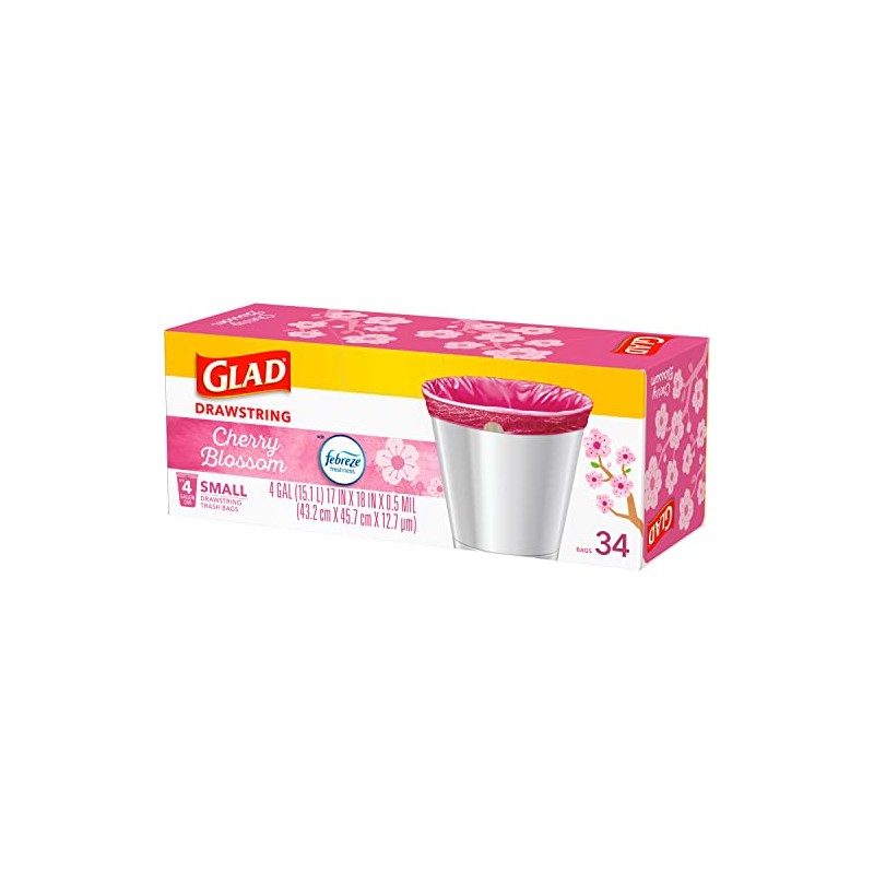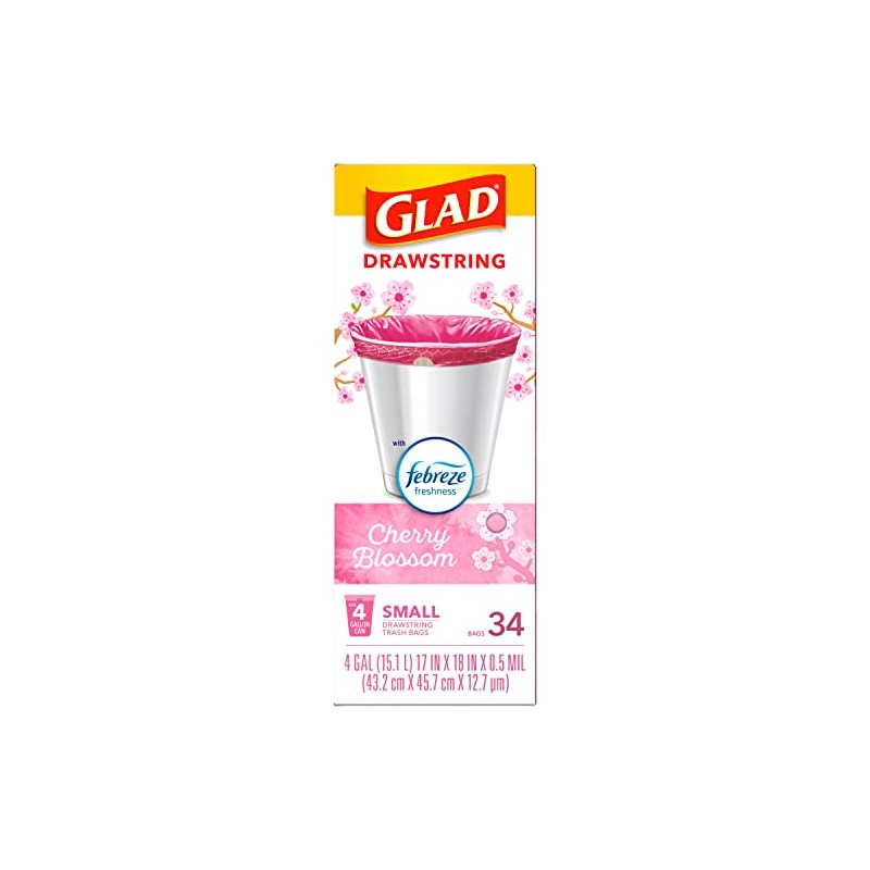 Glad OdorShield Drawstring Small Trash Bags with Febreze provide strength plus odor control, to keep your home smelling fresh. These small garbage bags are made with OdorShield technology and Febreze freshness to provide continuous odor neutralization, based on time lapse technical evaluation. Featuring a pink color and printed design around the internal ring of the bag, these trash bags add an aesthetic touch to any room when it is folded around the edge of the can. These 4 gallon size trash bags in a floral springtime scent fit small size trash cans and are great for in the bathroom, in home office, bedroom and laundry room. Certain trademarks used under license from The Procter & Gamble Company or its affiliates.